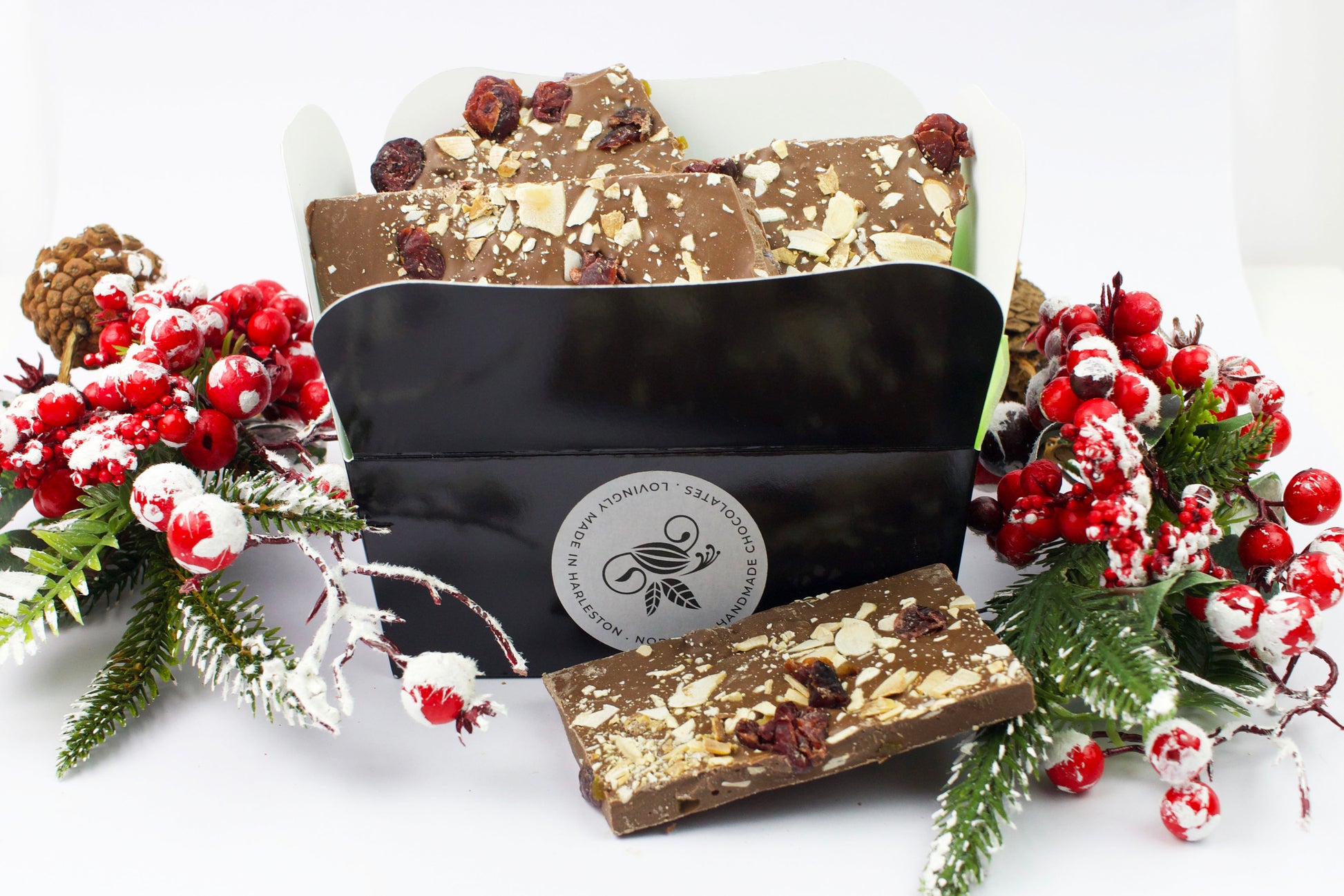 - Seriously thick pieces of creamy milk chocolate, embedded with orange pieces and cranberries, dusted with flaked almonds, in a 350g gift carton to cut and come again!