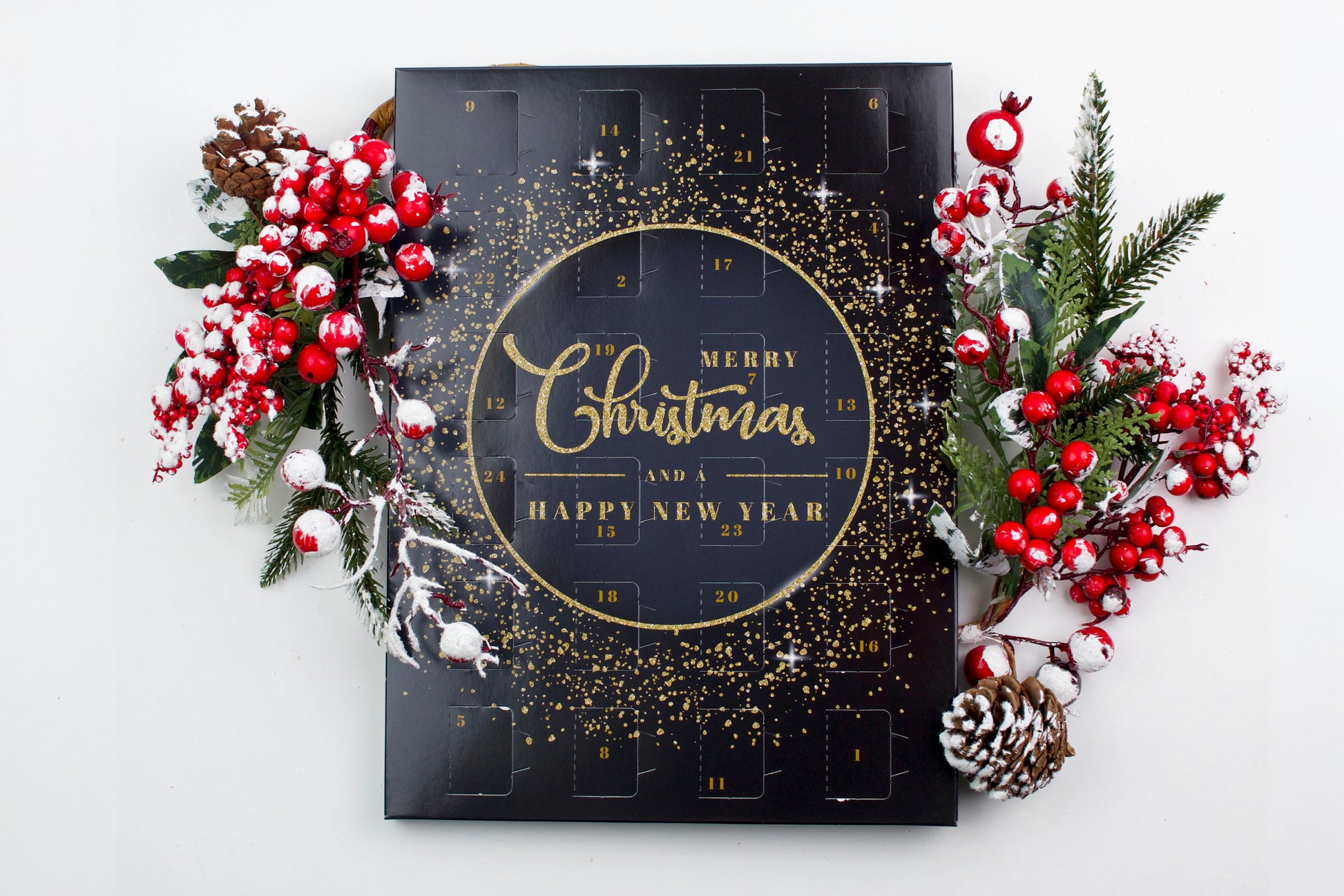 - 24 door advent calendar, offered in black and gold, or silver and white finish.