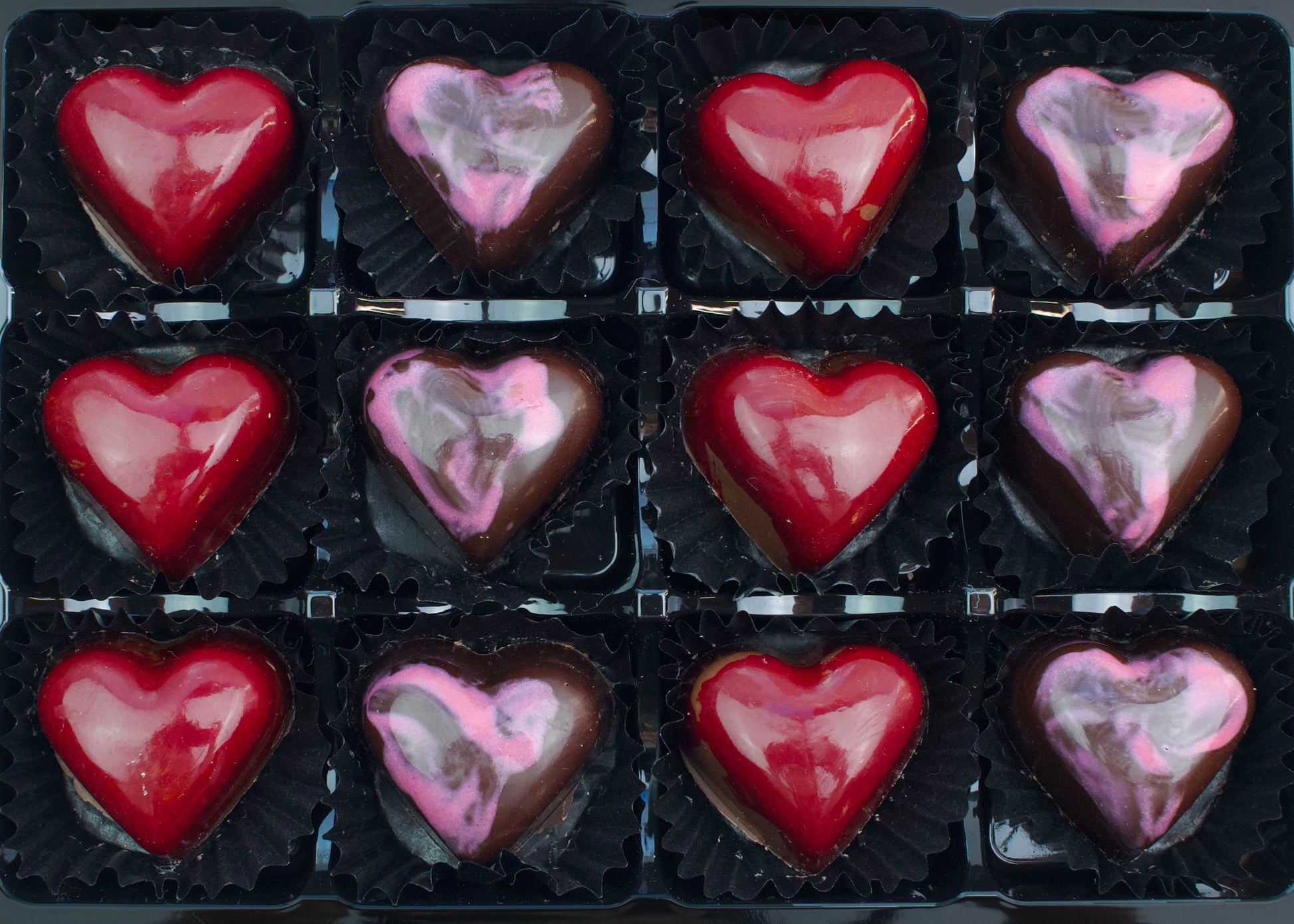 - Hand made milk and dark chocolate filled hearts, 6 each strawberry and red berries.