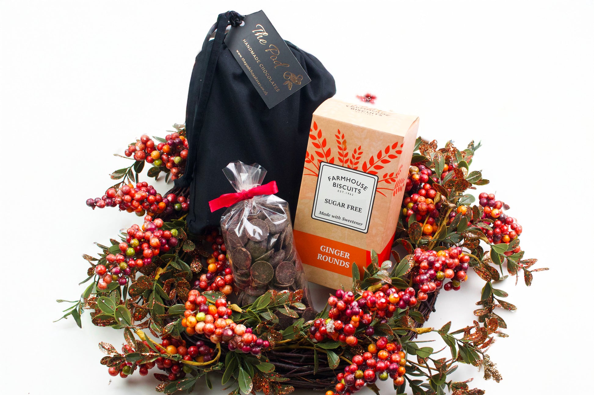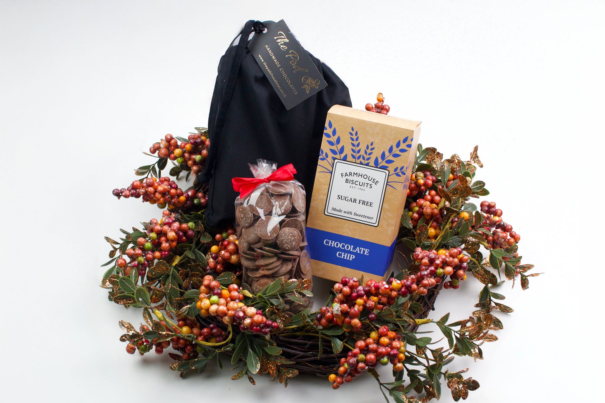 - Draw string bag containing sugar free chocolate callets and a pack of sugar free biscuits.